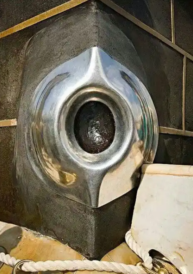 In the Eastern corner of the Cube, the stone is mounted and covered with polished looking metal.